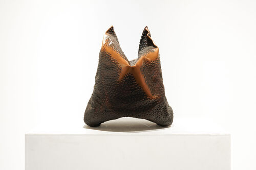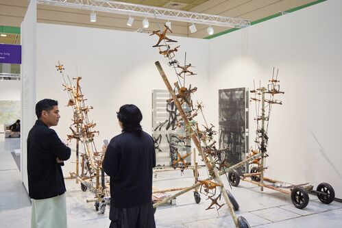 Tastemaking Japanese gallery CON__ presented one of the fair’s most striking installations. Taiki Yokote’s Floating Rubble (when the cat’s away, the mice will play) (2025) immediately commanded attention with its sheer scale and rustic materials.