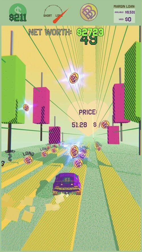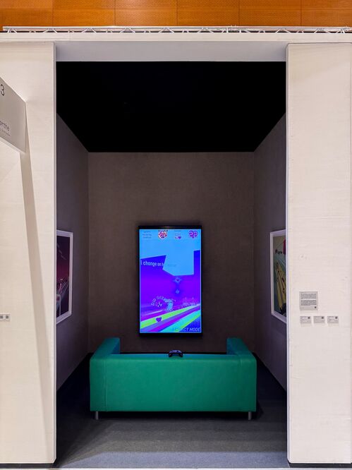 Moonboi (2025) is a participatory performance piece in the form of an endless car-racing game. Within the controlled environment, players are invited to reflect on the limitations of their agency. Chan likens the experience to socioeconomic structures, suggesting that engaging with the art market can feel like “striking coins in a game” with no certainty of winning.