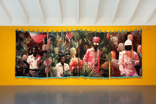 That origin story became the foundation of her art: a speculative utopia free of prejudice, where glitter is prevalent and agricultural workers are celebrated as royalty. This world is captured in her massive textile, I See All The Way Back To Where I’m Supposed To See (2024), at The Bahamas–based TERN Gallery’s booth.