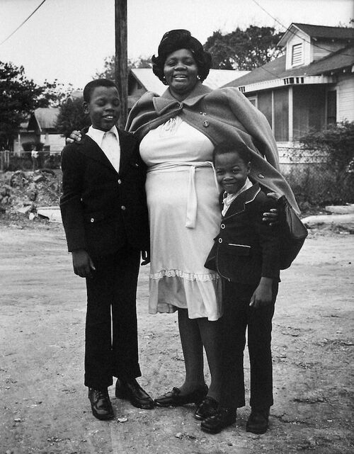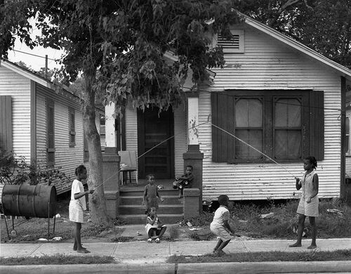 After returning from his tour of duty in Vietnam, Hudnall, Jr. studied art at Texas Southern University, where painter and muralist John Thomas Biggers encouraged him to draw from his own experiences. That advice shaped a lifelong practice: Hudnall’s black-and-white photographs—many set in the city’s historic neighborhoods like Freedmen’s Town—capture daily rituals. For instance, Street Champion, 4th Ward (1986) features a group of kids playing games on the street, particularly one kid wearing boxing gloves, with his arms raised in a champion stance.