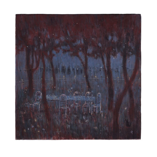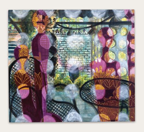 In Outdoor Dining (2025), for instance, Veldkamp sets a solitary figure with closed eyes in a vacant dining space, surrounded by empty chairs and tables. Light filters through a pattern evocative of breeze blocks, scattering circles across the surface, while translucent reddish silhouettes float in and out of focus. The result is a festive and melancholic atmosphere, where details shift between plants and ghostly presences, as if memory itself were slipping in and out of view.