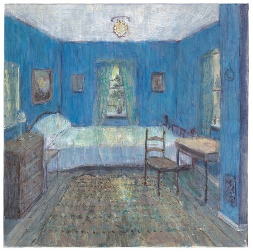 A spider web on a rain-trodden porch, figures skipping rocks on a dreary day, and a moody, empty bedroom: Mason Owens’s miniature paintings recall the intimacy of Vincent van Gogh’s famed Arles interiors.