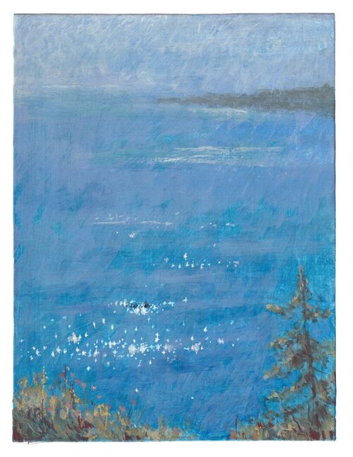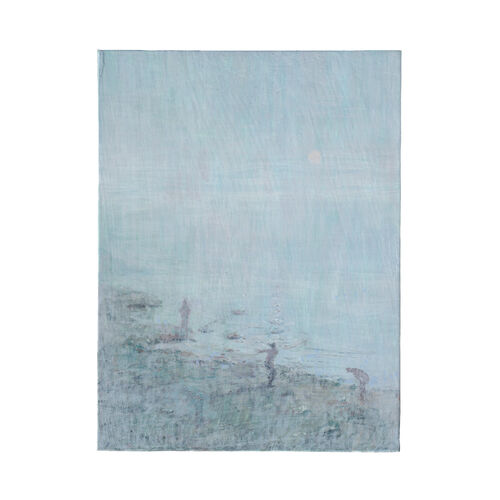 Owens’s panels, priced from $2,000 to $8,500, unfold with devotional slowness and a grounded attentiveness to the natural world. In paul’s little blue room (2024), a blue bedroom hums with stillness; in lets just cleanup tomorrow (2025), a night garden suggests spectral presences beneath its shadows. Meanwhile, the skipper and his first mate (2025) depicts two figures skipping rocks on a hazy body of water that bleeds into the horizon, giving the essence of a fleeting memory. Each work balances precision and fluidity, conveying the subtle passage of time—a breeze through a window, the faint silvering of dusk, the hush of evening descending.