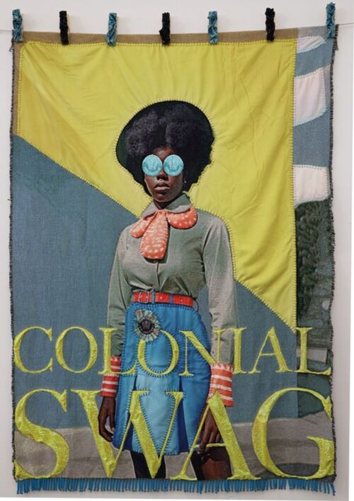 I See All The Way Back To Where I’m Supposed To See is a monumental Jacquard tapestry accented with sherpa, crushed velour, metallic thread, beads, adorned clothespins, and bamboo earrings. Priced at $112,000, the work envelops viewers in Atlantica’s lush, speculative cosmology, rendering a vision of liberation that is as tactile as it is expansive. “It’s a moment in the U.S. that feels dark, and her vision is about joy and finding joy and creating a world where there‘s beauty and rest and acceptance, and that’s a really powerful message right now,” TERN founder Amanda Coulcet told Artsy. The booth also features smaller works, including the surreal portrait COLONIAL SWAG: Say I Mean Something (2023).