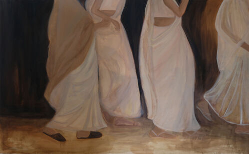 Joya Mukerjee Logue treats her paintings as a visual diary, capturing scenes such as bustling nighttime bazaars or clusters of conversing women. Raised in Ohio by an Indian American family, she merges her experience of Midwestern domestic life with South Asian cultural memory, creating portraits that read as both personal records and collective stories.
