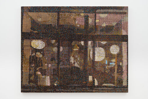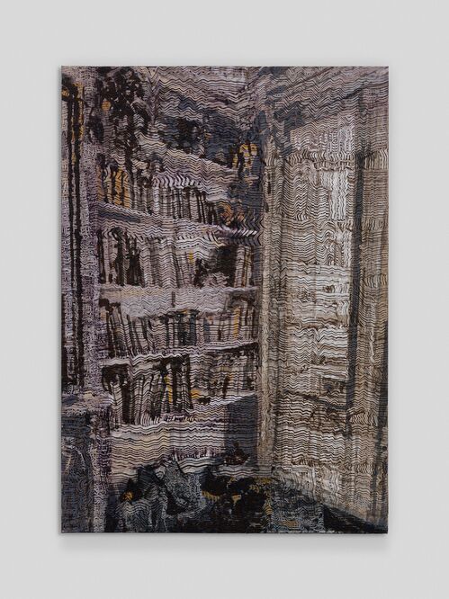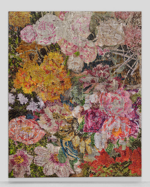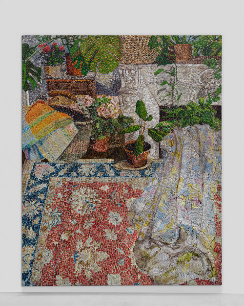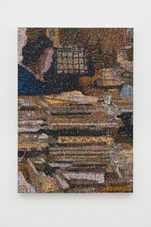 These new works are the subject of a solo show at Nino Mier Gallery in Brussels, “Echo,” on view through October 17th. In Interior with Books (all works 2025), a domestic scene dissolves into a mesh of flickering marks, while Millefleur erupts with blossoms that appear embroidered. Hodge’s fascination with fibers developed during two residencies at the Cité Internationale des Arts in Paris, where he studied French weaving traditions as a way to rethink painterly gestures.