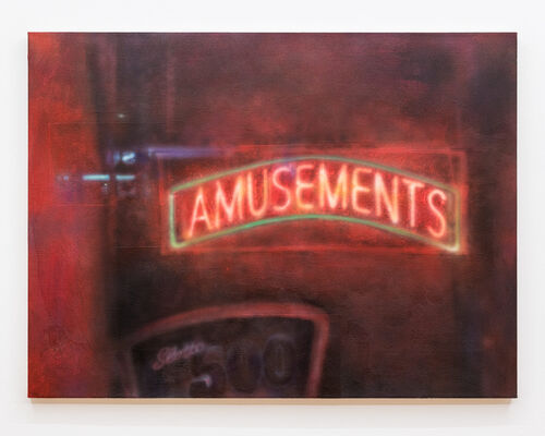 Moments here feel as though they pass quickly but linger emotionally. This is manifest in Back to my fantasy (2025), where a luminous sign reading “amusements” beams out from a murky window; the title of the work suggests revisiting an imagined state, nodding to a tension between what is real and what is remembered.
