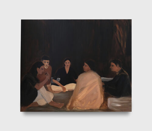 A selection of such works stood out in Rajiv Menon Contemporary’s booth at Untitled Art, Houston last month. They featured figures in near-darkness, their gestures charged with quiet intensity. In Tala’s Roses (2025), a woman with a worried look on her face clutches a bouquet close to her chest. Storytellers (2024) shows a circle of women leaning toward one another, their configuration suggesting ghost stories told around a campfire. Soft brushwork and earthy tones make these works gentle and inviting.