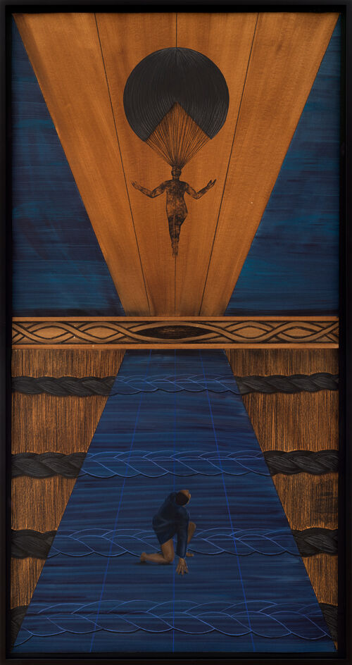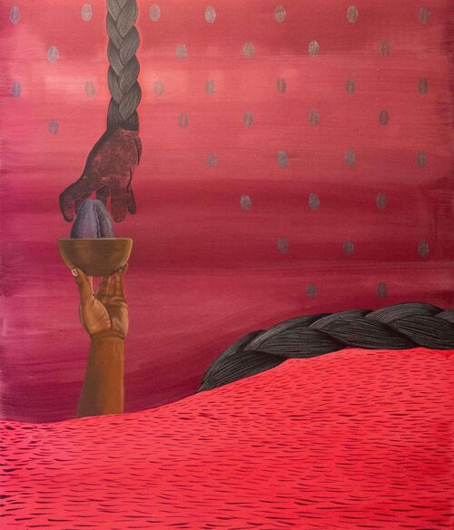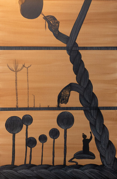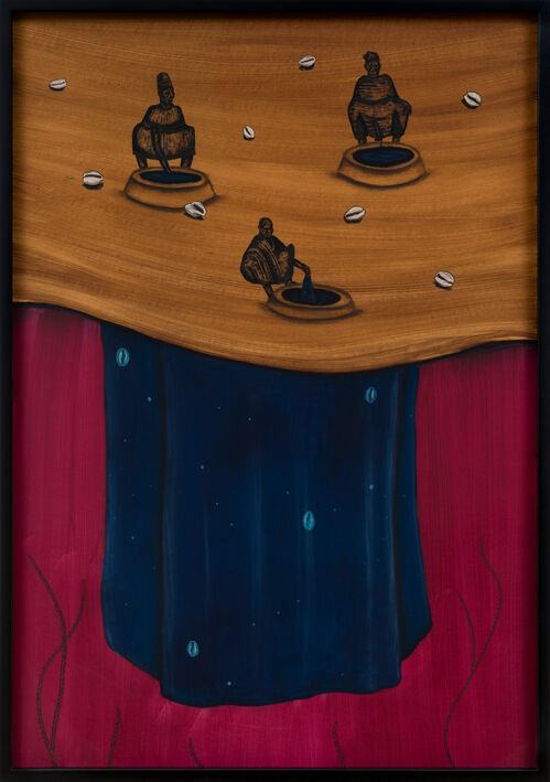 Spirits, braids, and shells feature in Bunmi Agusto’s surreal compositions, which combine fantasy with elements of West African folklore. In her latest solo exhibition, “Tales By Moonlight,” on view at Tiwani Contemporary in London through November 1st, the artist presents a new body of work spanning drawing, painting, printmaking, and moving image. These new works continue her world-building practice, taking place in the self-referential fictional universe the artist calls “Within,” where her alter ego is the protagonist.