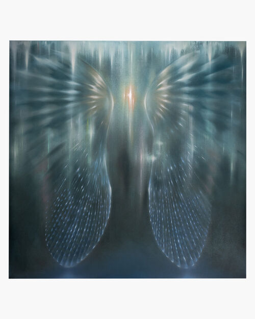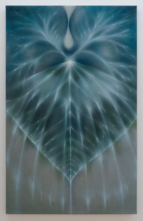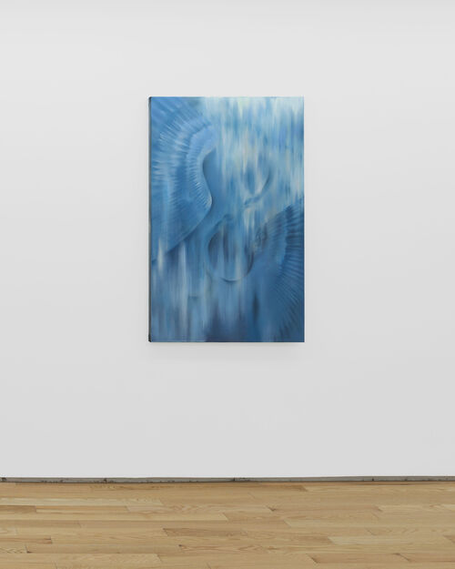 At her debut show at island in New York, on view through October 11th, her subjects include a rain-drenched leaf, a pale egg, and a nautilus shell. These natural elements are portrayed with the careful reverence of Renaissance still lifes, with solid-colored backgrounds that deepen the focus on the central subject. Elsewhere in the show, works like Hilma (all works 2025) contain traces of Xiong’s airbrushed illustration style. This effervescent blue canvas subtly evokes an angel’s wings—a theme the artist returns to in other paintings, such as Prayers. In Xiong’s hands, this mythological motif appears dazzling, shimmering with light.