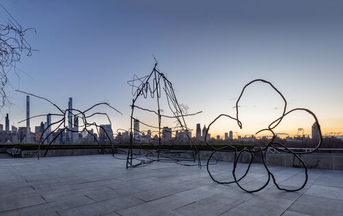 Halilaj often transforms drawings into sculpture. For his show at Tate St. Ives in 2021, he presented more than 80 suspended felt forms, each an enlarged and reworked replica of 38 drawings he had originally created with Italian psychologist Giacomo Poli in a refugee camp in 1999. More recently, his commission for the Metropolitan Museum of Art’s 2024 Roof Garden reworked a 2015 project, where he took children’s drawings and turned them into stainless steel and bronze sculptures.
