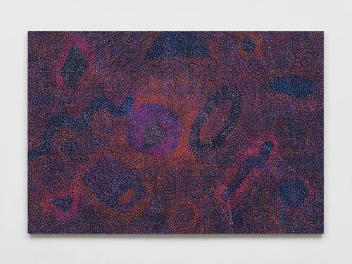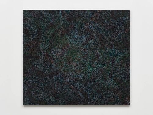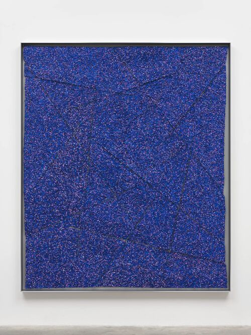 Three women artists of different generations consider the wonder of the cosmos in White Cube’s booth. American artist Howardena Pindell (whom the gallery began representing last year) exhibits recent works in her classic dotted style. Deep Sea #2 (2024) depicts the dark of the ocean in stunning swirls of blue and green dots. Meanwhile, the large work Night Flight (2024) stitches together different segments of the canvas in a bright blue, covered in paper dots that evoke the microscopic elements of our world.