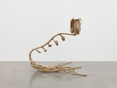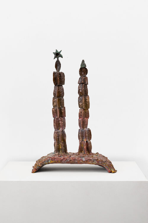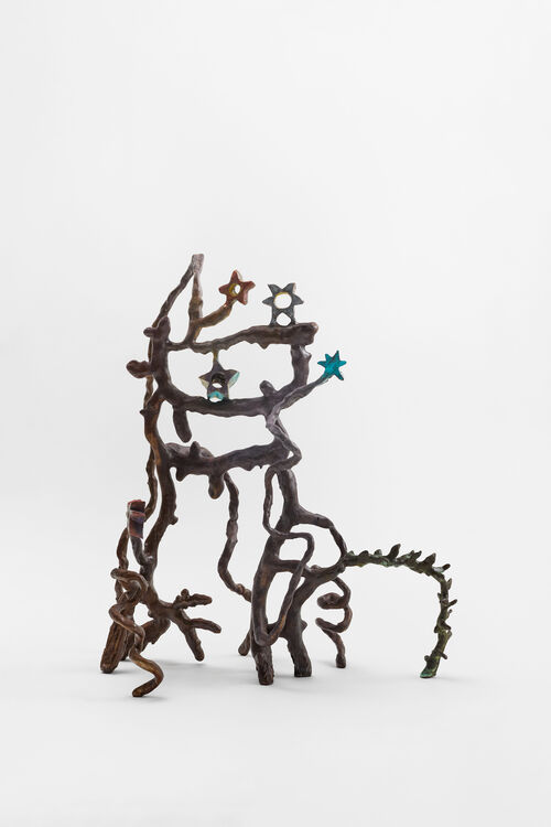Their twisting, stem-like sculptures, for instance, are crafted first in beeswax and allowed to melt in the sweltering São Paulo heat before being cast in bronze. The young Brazilian artist then adorns the works with fruits, such as the star-shaped carambola, which lend a local, natural flair. According to Diambe, who was present at the booth, these pieces are “about the transformation of this material and also how it’s witnessing climate change.”