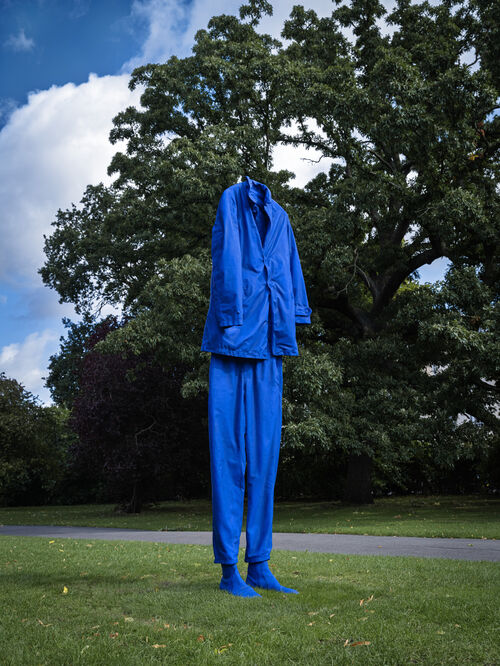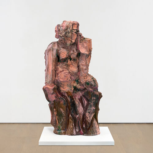 Crews-Chubb also sees himself reflected in his new series of sculptures, which mark the first time he’s worked in three dimensions. These works are made out of wooden tree trunks and covered in plaster and paint to create monstrous statues. Guardian II (Teal and Pink) (2025), for instance, is a one-armed figure, thick with chunky acrylic paint, with the ridges of the tough bark still visible underneath. Crews-Chubb’s distinctive Abstract Expressionist painting style is visible in both formats. Prices range between $70,000 and $90,000.