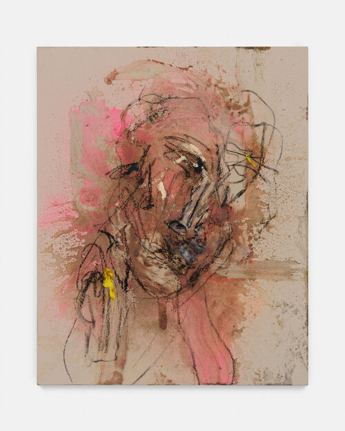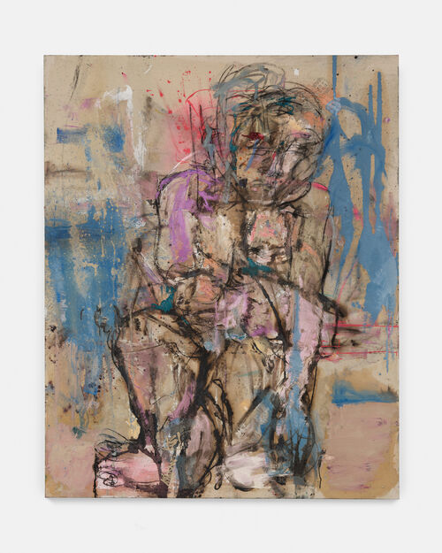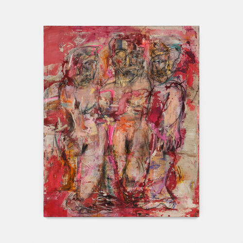British artist Daniel Crews-Chubb is known for his gestural, large-scale paintings: exuberant colors and impasto textures created with a mix of media. Several of his latest imposing works are on view at the London and New York gallery Timothy Taylor’s booth, like the almost three-meter-tall Out of Chaos XIII (Red) (2025), which depicts three hulking nude figures. Scratched out in charcoal on a raw canvas, the figures are rubbed, sploshed, and splashed with paint, ink, and other collaged elements to create a pink-red work that the artist sees as representing an extension of himself.