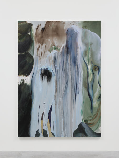 Hiroka Yamashita’s paintings, based on animist Japanese philosophy, are the stars of the show at Tokyo gallery Taka Ishii’s booth, which presents works by three Japanese artists. Nature and humans melt into one another in Yamashita’s flowing, heartfelt paintings. One, entitled Waterfall (2025), is inspired by the Japanese myth of the waterfall god slaying an eight-headed snake and using water to cleanse his sword. White and blue paint whooshes down the canvas, echoing both the waterfall and the mythological scene.