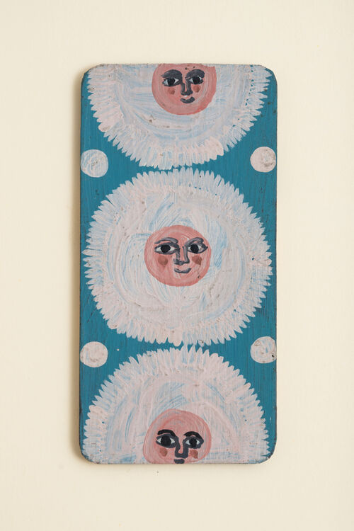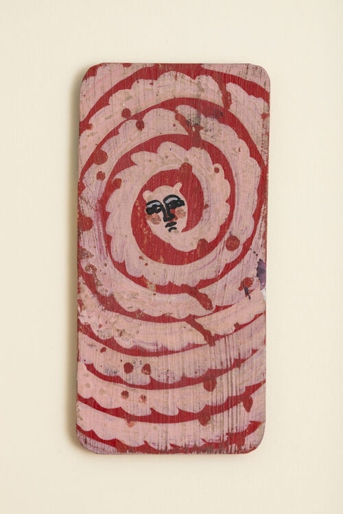 Covering the walls of Paris gallery Loeve&Co’s booth is a collection of the artist’s tarot-card-sized “Mes Nuits” works on cardboard. These small works feature several recurring motifs rendered in a style both humorous and eerie, including haunting figures, spirals, vegetal forms, and faces that evoke human and animal characteristics. “He created around 3,000 of these, and there are a lot of symbols and influences,” said gallery director Jules Vannier. “He never showed anything to anyone until 1967, when he started doing this series.”