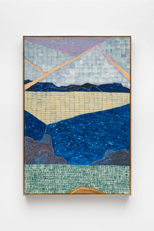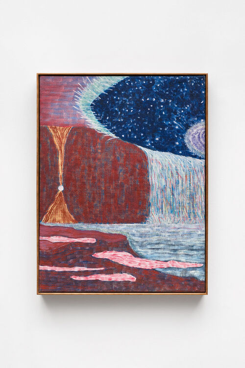 Their small, vivid paintings, meanwhile, are made with egg tempera, a fast-drying paint that requires the artist to paint each section in small flicks of colored dashes, as if tiled. Capricorn (2025), for instance, reveals a glowing blue mountain peak through a dark cave-like viewpoint. Diambe noted that the technique also helps to preserve the color, which is layered into vibrant swatches in these landscapes.