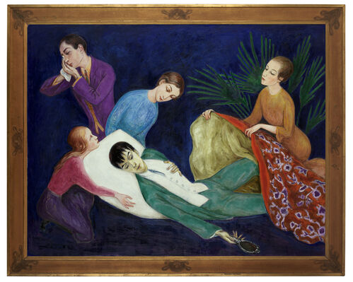 “Tchelitchew criticized Picasso’s analytical Cubism and sterile modernism for being lifeless and for not being able to capture life, sexuality, desire, and physical forms of embodiment,” said Kempkes. Elsewhere in the show, works explore the expression of queer identities in the early 20th century, when homosexuality was still criminalized for men and socially taboo for women across Europe and the U.S. In Glyn Warren Philpot’s Penelope (1923)—a standout painting, which sold for over £337,000 at auction in 2021—queer desire is camouflaged in Greek mythological imagery. Though the title refers to Odysseus’s wife from Homer’s Odyssey, Penelope almost recedes into the canvas as she’s depicted on a chair, weaving a shroud.